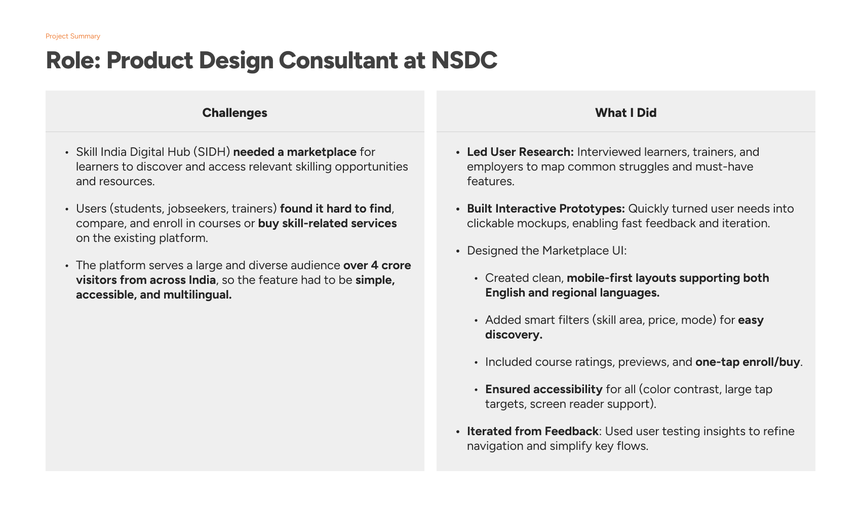Skill India Digital Hub is an online platform aimed at skilling, reskilling, and upskilling individuals across India, with over 4 crore platform visitors. In this project, I led the design of a new feature called the SIDH Marketplace—conducting user research, creating prototypes, and designing the UI based on key user insights.