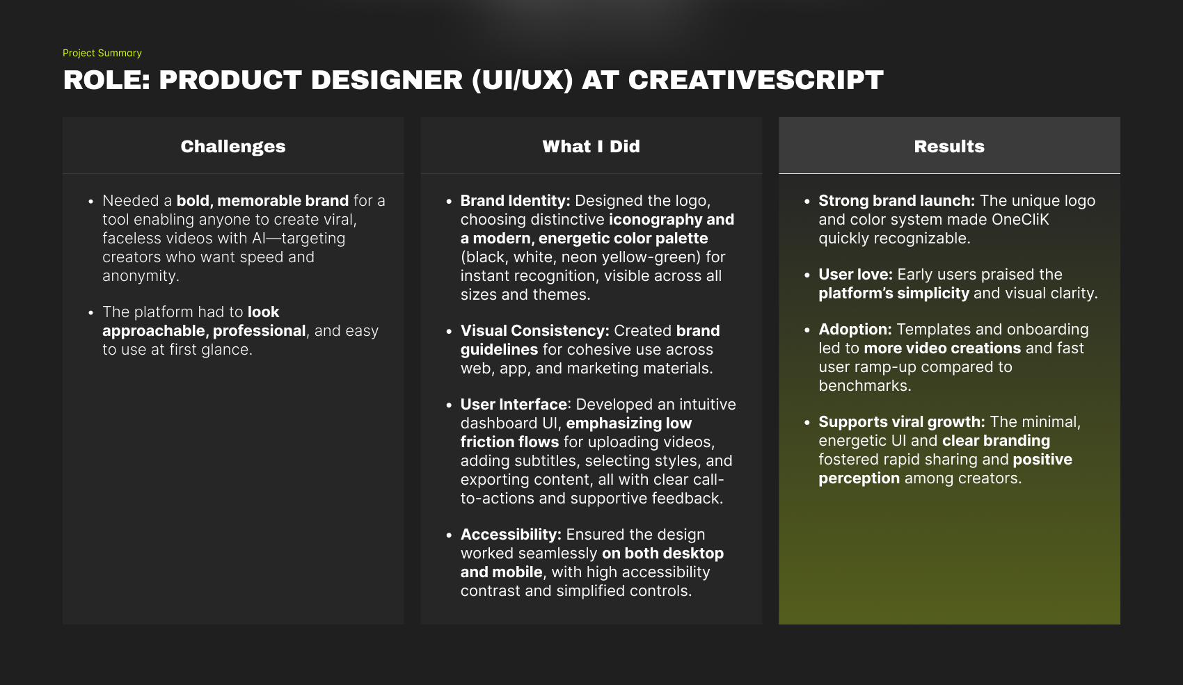 OneCliK is the simplest tool for creating faceless viral AI videos. In this project, I was responsible for developing the brand identity, including the logo design, brand color palette, and user interface design.